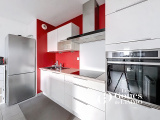 La pièce de vie offre un séjour spacieux avec cuisine ouverte entièrement équipée, complétée par un grand plan de travail faisant office de table à manger.