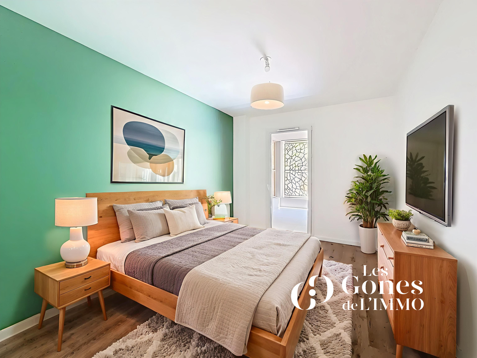 - Une chambre confortable de 13 m² dotée d’un grand placard coulissant aménagé et disposant d’un accès direct sur la terrasse et le jardin